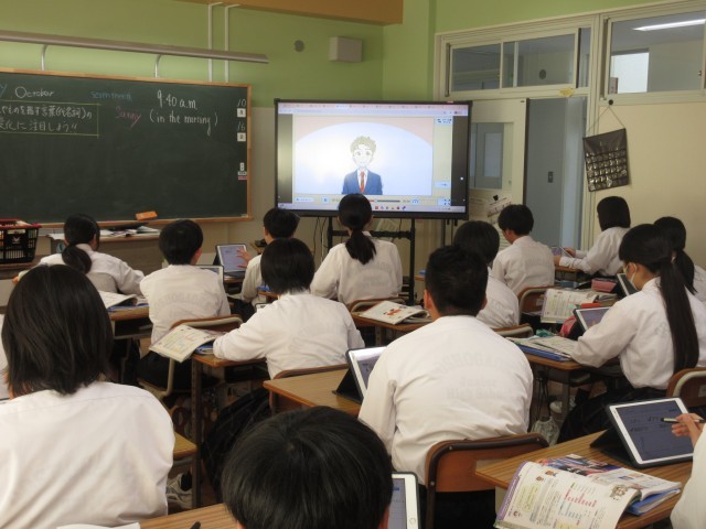 1年生の英語の授業では、デジタル教科書を活用し、会話の練習に取り組んでいました。教科書の文章を音として聞き取ることができるので、英語の授業では有効に活用しています。