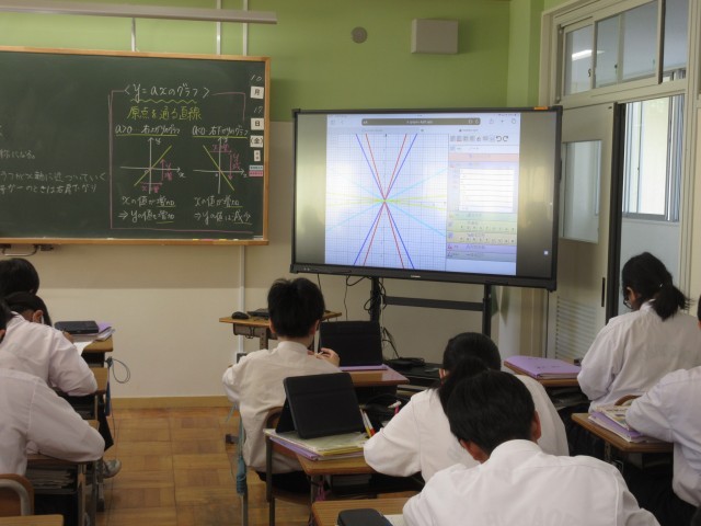 同じく1年生の数学の授業では、電子黒板を活用し、数値を変えるとどのようなグラフになるかを視覚的に確かめながら授業を行っていました。