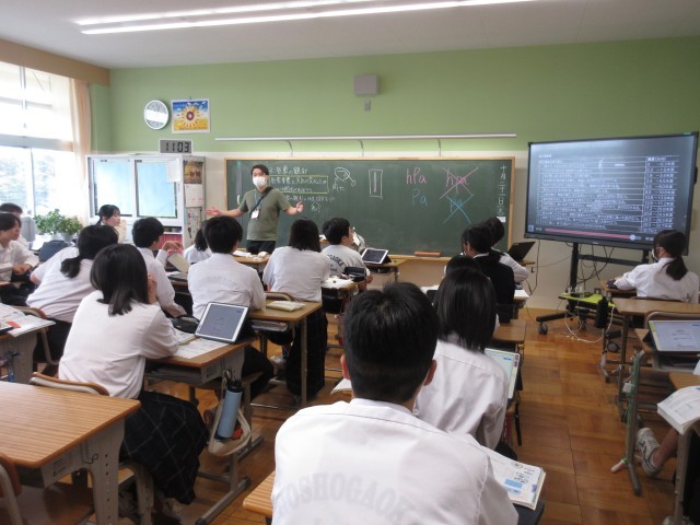 2年生の理科の授業では、自分がこれまで体験した風の強さについて話し合い、それがどのくらいの風力なのか、考えていました。