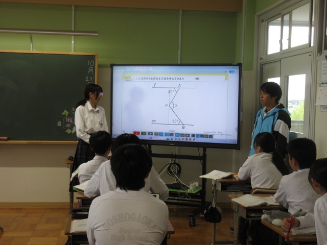 同じく2年生の数学の授業では、角度の大きさを求める学習に取り組んでいました。画面に直接書き込みながら、分かりやすく説明する姿が見られました。