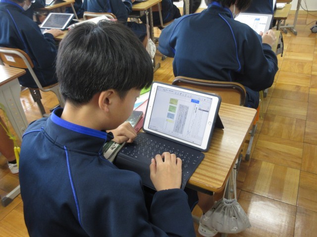 1年生の国語の授業では、各自が書いた意見文をタブレットで共有し、感想を書き込んでいました。友達の文章をしっかりと読み、良さを見付けることができました。