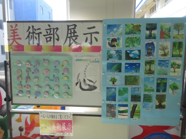 全校美術展示と併せて、美術部の作品が1階昇降口までに展示されています。