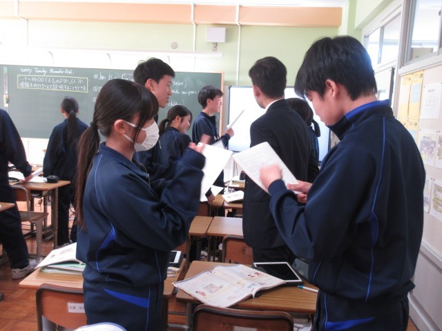3年生の英語の授業では、自らが作った英作文を互いに読み、聞き合う活動を行っていました。隣の席の友達とコミュニケーションを図りながら活動していました。
