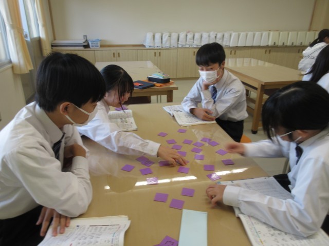 2年生の家庭科の授業では、洗濯物に表示されている記号をカードにし、神経衰弱のゲームとして取り組んでいました。遊びながら楽しく学んでいます。