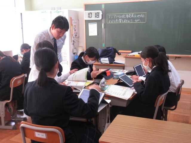 1年生の社会科の授業では、調べ学習を行っていました。調べ学習が終わった生徒は、教科書にあるQRコードを読み取り、端末を使って確かめ問題に取り組み、知識の定着を図っていました。
