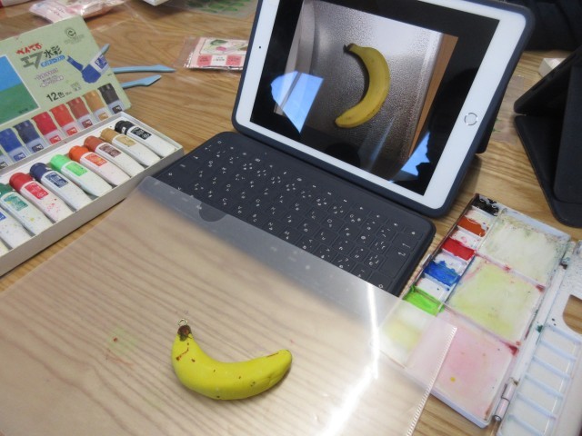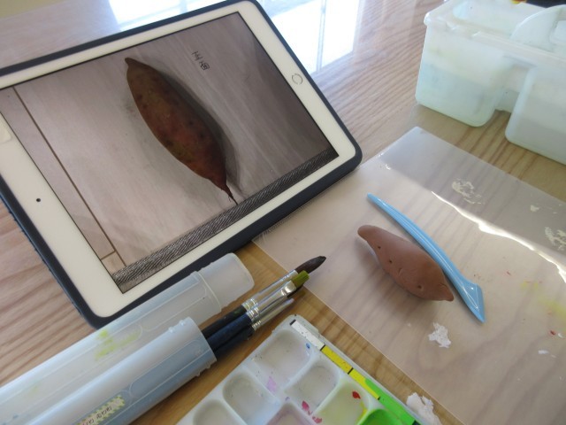 5時間目の1年生の美術の授業では、粘土の作品作りに取り組んでいました。「本物そっくりにつくるには、どのようなことに気を付ければよいだろうか?」という課題のもと、自分で作りたいものをタブレットで事前に撮影し、それを見ながら形にしていました。中には本物そっくりのバナナやさつまいもを作り上げる生徒もおり、そのリアルさに驚かされました!