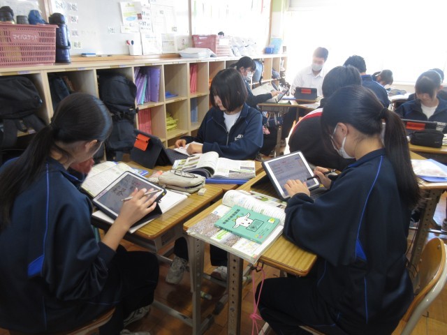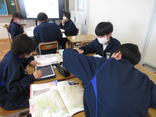 本日の課題は「東海地方で社長になるなら、どのような業種・業界を選ぶべきだろう?」という課題のもと、ワークシートに記載されている資料や地図帳等様々な資料を活用しながらグループになって調べる姿が見られました。生徒の興味を引きつける課題を提示することにより、資料から読み取れることを深く考える活動となっていました。