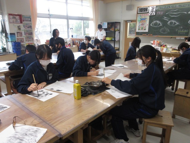 英語や数学の授業では、先生の説明を聞き漏らさないよう、真剣なまなざしで授業を受ける姿が見られました。一方で、国語の授業ではグループごとに発表する様子や、美術では友達と会話をしながら楽しく作業に取り組む姿が見られました。