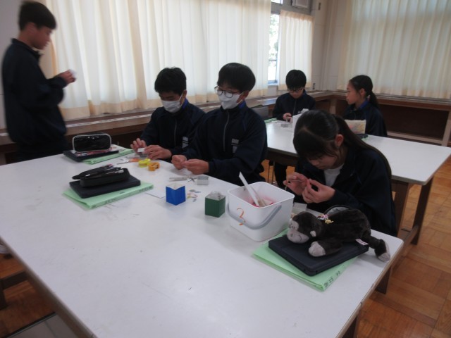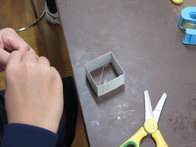 画用紙とクリップが配られ、それらを使ってより丈夫な形を作ります。生徒たちは周りの友達と相談しながら作業に取り組んでいました。