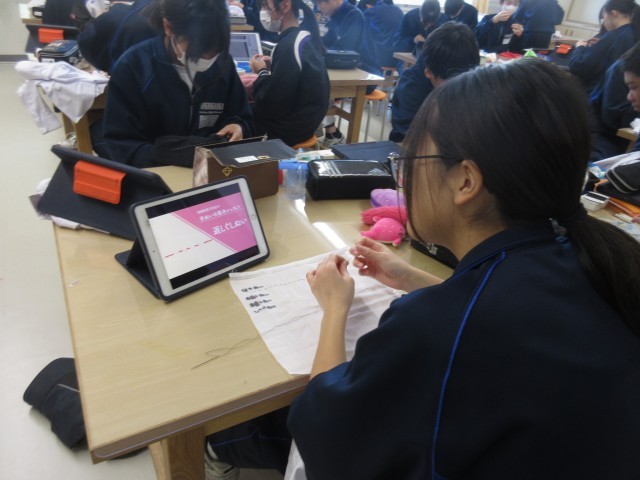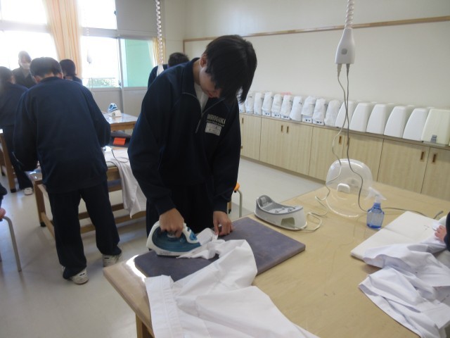 裁縫では、動画を見ながらいろいろな縫い方に挑戦していました。アイロンがけは、生徒たちに聞くとあまりやったことがないとのことでしたが、ワイシャツを丁寧にアイロンがけし、きれいに仕上げていました。