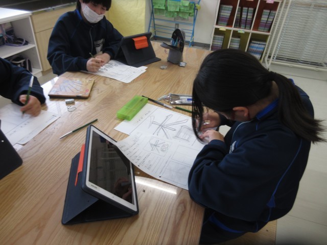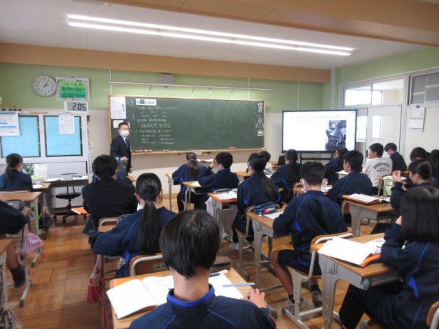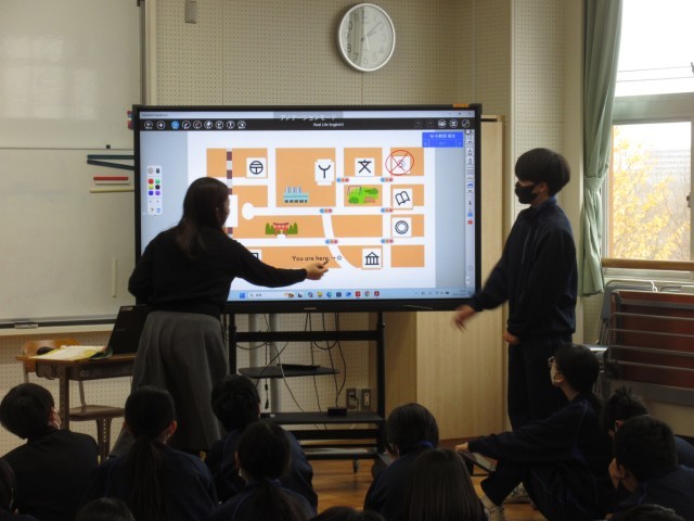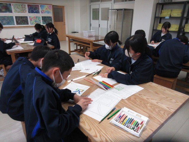 1年生の英語の授業では、道の行き方を質問された際の答え方について考え、代表生徒が発表しました。美術の授業では、文字を絵で表すことに取り組み、各自が工夫しながらオリジナリティあふれる作品作りに取り組んでいました。