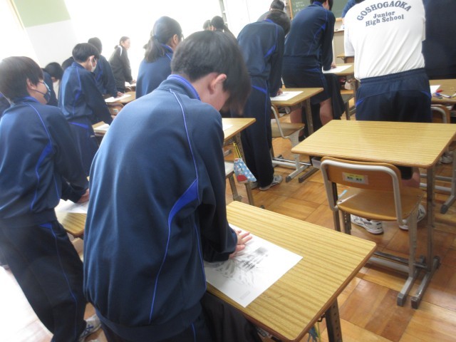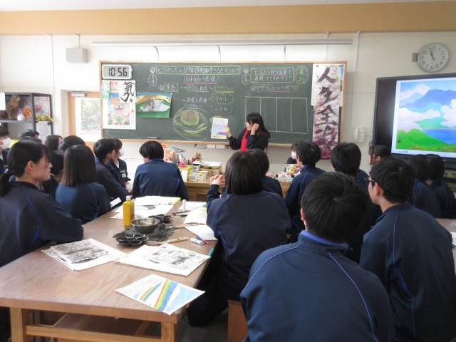3年生の美術の授業では、先日おこなされた実技のテストに対し、先生が感想や良さを解説しながら皆で鑑賞していました。一人一人の作品に対し拍手をし、温かい雰囲気の中授業がおこなされていました。