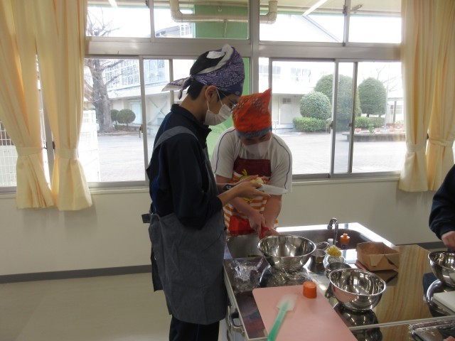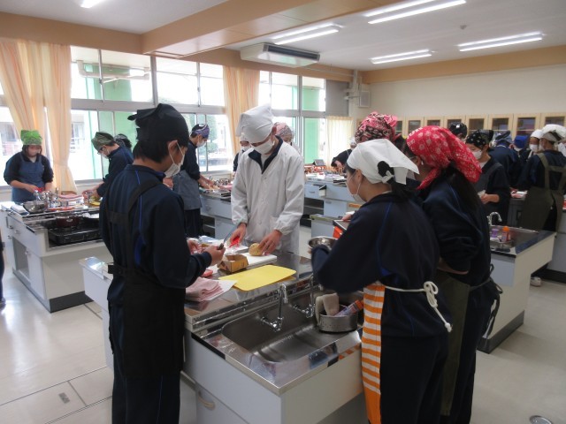ジャガイモの皮むきに苦戦していましたが、中にはピーラーを使わずに包丁で上手に皮むきをする生徒も見られました。グループ内で仕事を分担しながら楽しそうに調理をしていました。
