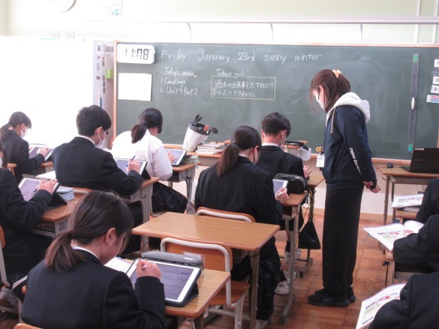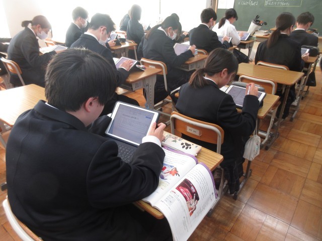1年生の英語の授業では、「過去の出来事を尋ねたり答えたりできるかな?」という課題のもと、自分の冬休みの出来事をまずは日本語で作文し、それを英文に直すという活動に取り組んでいました。タブレットを活用し、一人一人課題に向き合いながら、文章を考える姿が見られました。