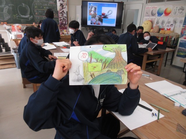 2年生の美術の授業では、篆刻のデザインに取り組んでいました。ただ印影をデザインするだけでなく、形全体も彫り進めることで、個性的な作品に仕上げることを目標としています。各自が自分の好きな物をイメージし、どんな形にしたいか考えながら取り組んでいました。