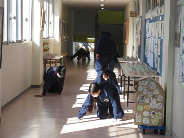 清掃の時間、黙々と廊下のぞうきんがけに取り組む生徒たちです。