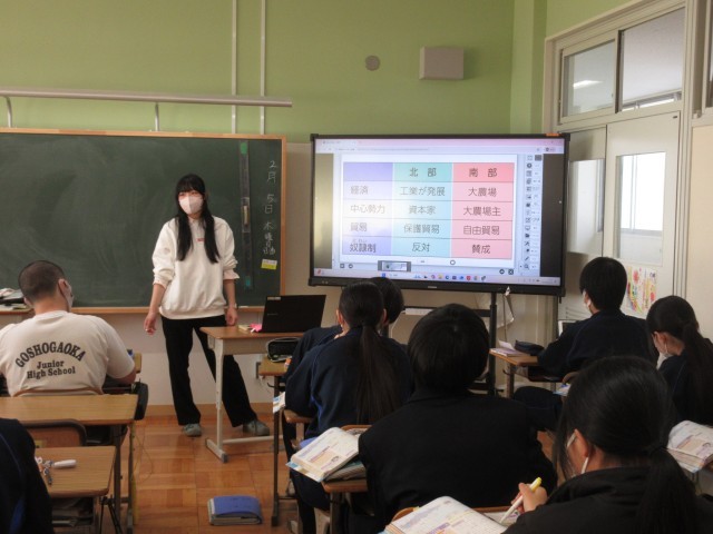2年生の社会科の授業では、アメリカの発展について北部と南部に分けて各自が調べ学習に取り組んでいました。