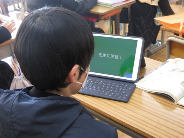 2年生の英語の授業では、生徒のタブレット画面に「先生に注目!」の文字が。