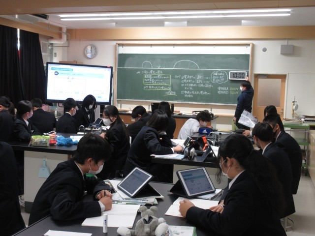 2年生の理科の授業では、電圧と電流の関係について、タブレットを使って問題を解く活動に取り組んでいました。
