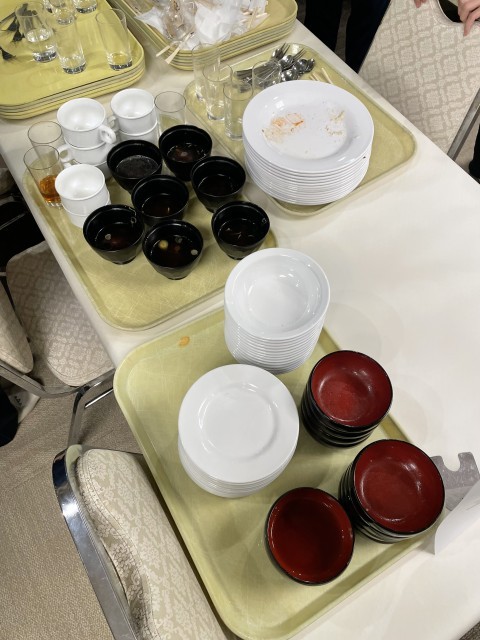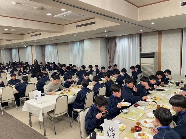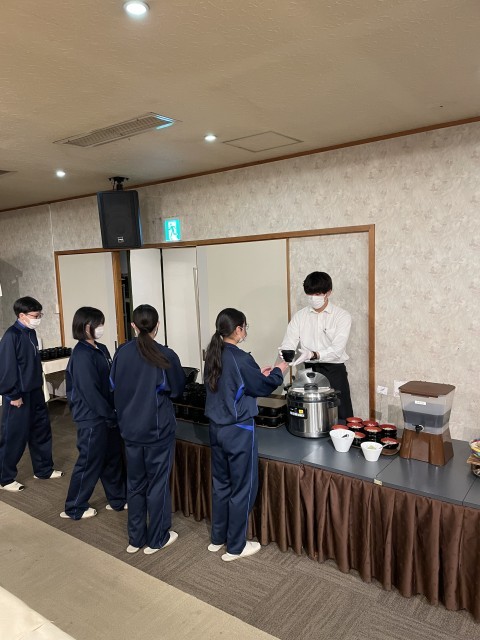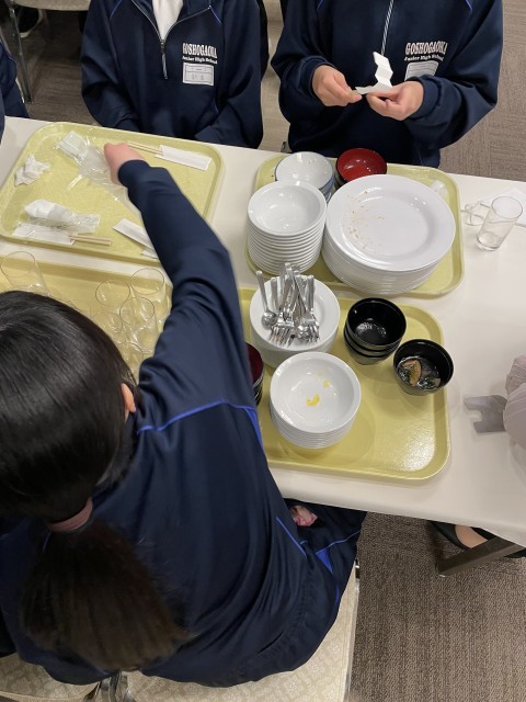 夕食はバイキングです。選ぶのも食べるのも楽しく、おかわりもして、たくさんおいしくいただきました。運動した後の食事は特においしいです。テーブルごとに食器をまとめて、協力して片付けやすくできました。