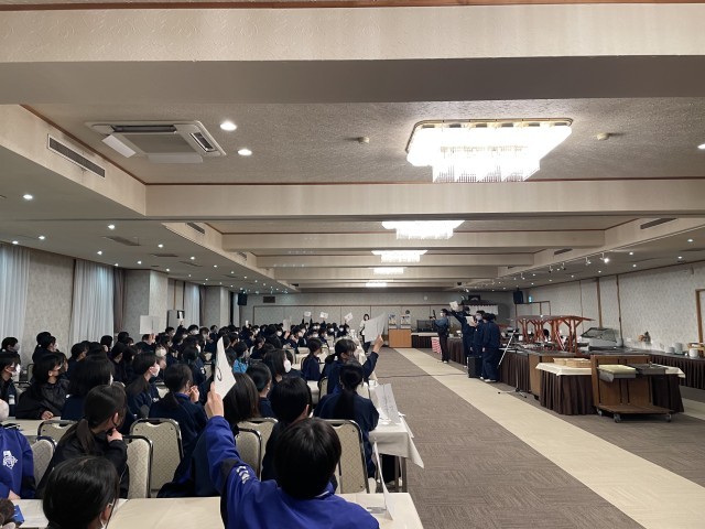 学年レクは、先生当てクイズ・雑学クイズ・イントロクイズを行いました。各クラスの男子・女子に別れた10チーム対抗で競い、接戦の末、4組女子が優勝を勝ちとりました。スキー学習実行委員の皆さん、みんなが楽しめる企画をありがとうございました!