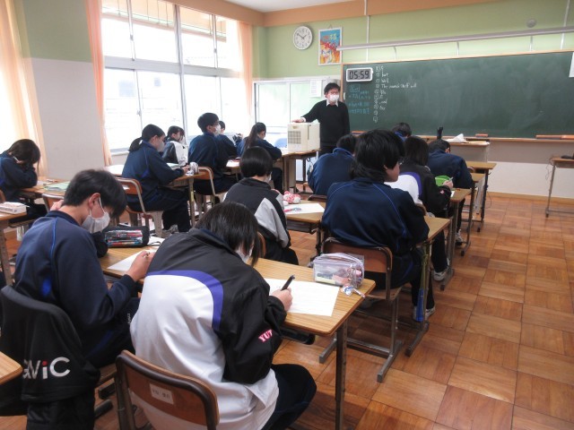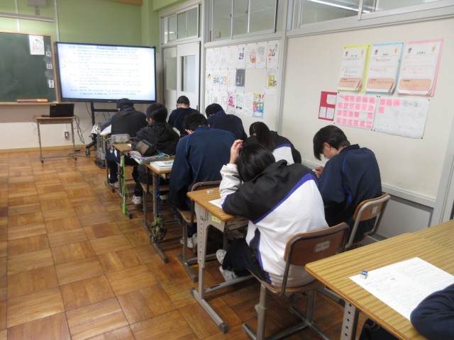 3年生の英語の授業では、2日後に迫った茨城県立高校入試に向けて、仕上げのプリントに取り組んでいました。