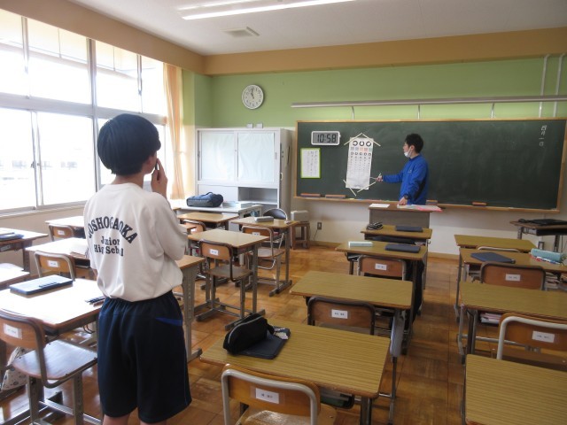 女子は調理室で聴力検査を、男子は教室で視力検査を行いました。中学生は身体が成長する時期です。一年後、どれくらい成長しているか楽しみですね!