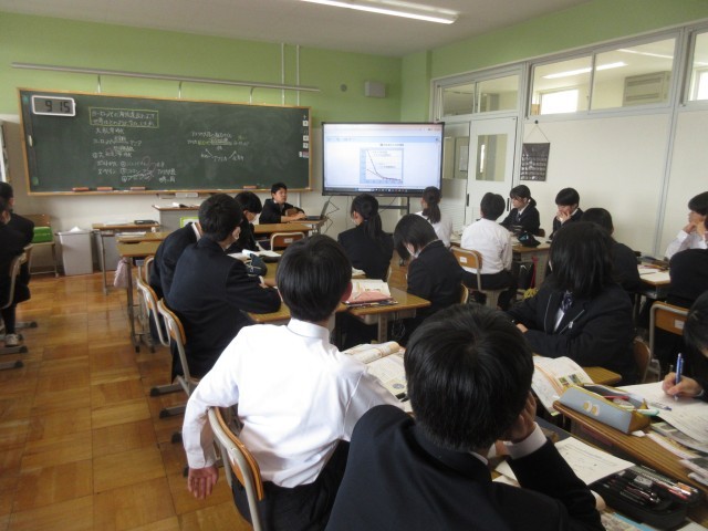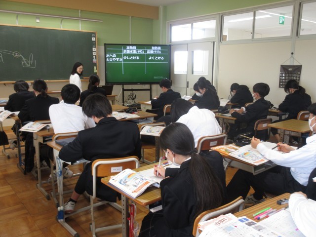 水溶液を加熱した時としない時では水への溶けやすさはどうなるかについて考えていました。各自が先生の話を聞きながらノートにまとめていましたが、とても丁寧にノートをまとめている生徒がいました。自分で分かりやすいように考えてノートをまとめている様子がよく分かりました。