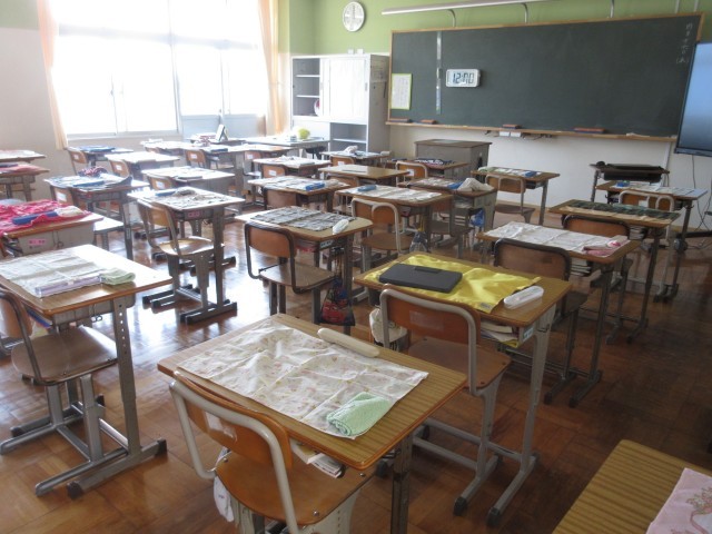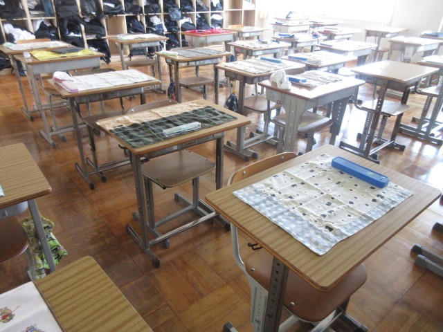 4時間目にある教室を覗いてみると、移動教室のため、誰もいませんでしたが、机の上にはテーブルクロスと箸が置かれていました。
