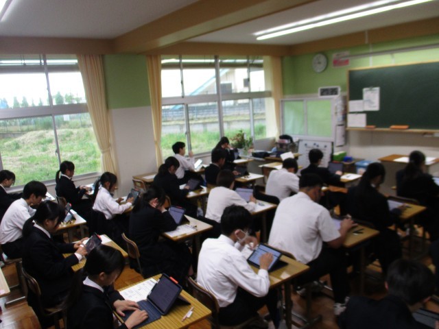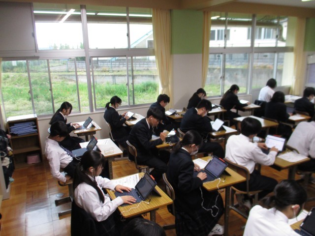 3年生が、全国学力学習状況調査の英語「読む・書く」「聞く」を行いました。来月の「話す」を含めて、今年度の英語科の調査は全てタブレットで行います。みんな緊張感をもって臨みました。明後日は、国語科と数学科の調査を、紙媒体の筆記テストとして行います。
