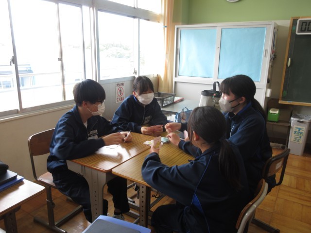 男女のグループでしたが、どのグループも引いたカードに対して英語で回答し、いい雰囲気の中で楽しそうに活動していました。
