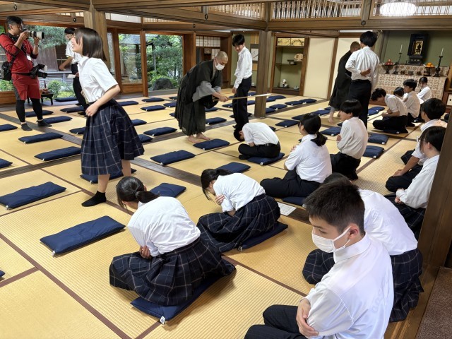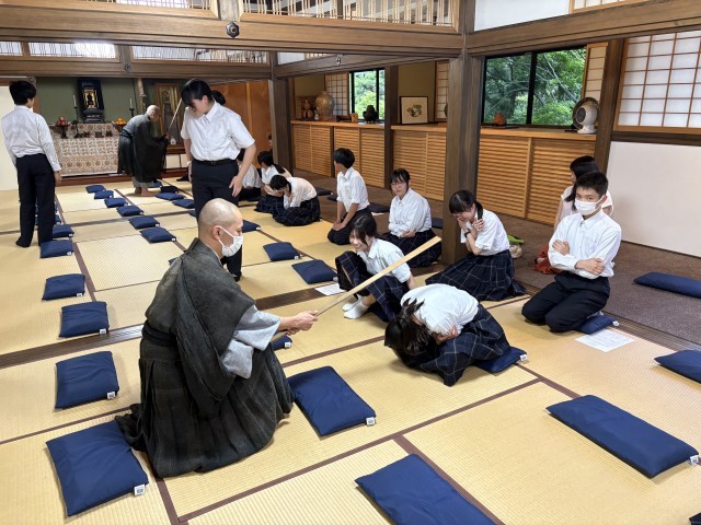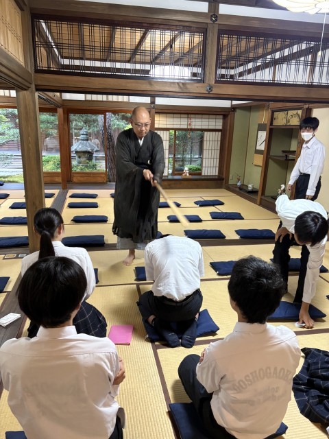 座禅の説明を聞き、15分間の座禅に取り組みました。灯りが消され薄暗い中、心を無にして皆頑張りました。