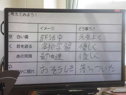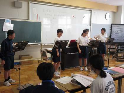 5月21日(火)今日の授業風景 その9 公開日 2024/05/21 更新日 2024/05/21 お知らせ 1年生の音楽科の授業です。 歌詞の意味や曲の構成を考えて、「主人は冷たい土の中に」を歌う生徒たち。歌詞を区切ってその「イメージ」と「どう歌うか」を考え、実際に合唱に取り組む生徒たち。一人一人がしっかり声を出して歌うことができる学級の雰囲気がいいですね!