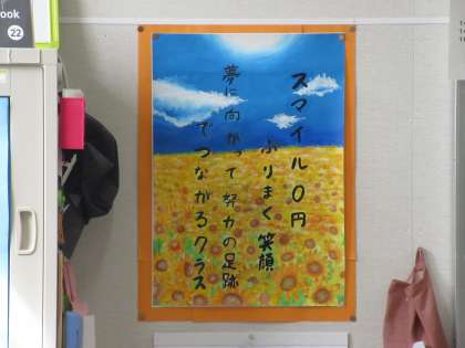 3年6組の教室を訪ねた時は、ちょうど担任の先生が全体での練習に臨む心構えを話しているところでした。相手の目を見て真剣に話を聞く姿、みんなで声を合わせて返事をしたり頷く姿・・・。今日の目標の「全力で予行練習に取り組もう!」をしっかりやりとげていこうという雰囲気を感じました。3年6組の学級目標は「スマイル0円 ふりまく笑顔 夢に向かって 努力の足跡でつながるクラス」です。笑顔を大切にして、様々なことに努力し、夢を実現させていってくれることでしょう!