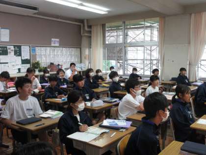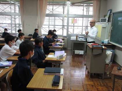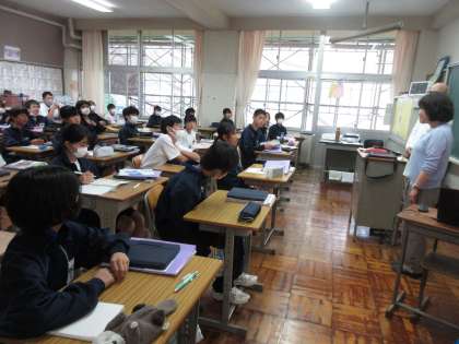 5月27日(月)今日の授業風景 その1 公開日 2024/05/27 更新日 2024/05/27 お知らせ 1年生の英語科の授業です。 「身近な人やものを紹介できるようにしよう」をテーマに学習を進める生徒たち。授業の初めは、簡単な英会話から。担当の先生やALTとのやりとりを通して、英語の学習へのエンジンがかかる生徒たちです。