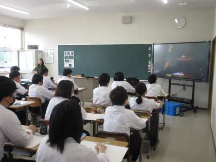 「力のつり合いと慣性の法則」について学習を進めていました。テーブルの布の上に置かれたリンゴとおさら、布を引っ張った時の様子を映した動画を見て、疑問を膨らませる生徒たち。「?」が広がり、これからの追究が楽しみになります!