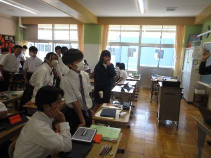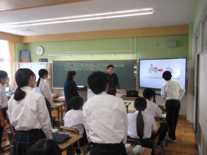 6月11日(火)今日の授業風景 その5 公開日 2024/06/11 更新日 2024/06/11 お知らせ 2年生の英語科の授業です。 「夢の実現のためにどんなことを頑張っているか英語で表現する」というテーマのもと学習を進めていました。教室を訪問した時は、電子黒板に映し出された人物が何のために行っているかをイラストから考え、英語で表現している場面でした。笑顔で英語を活用しながらコミュニケーションをとる生徒たち。頑張っていました!