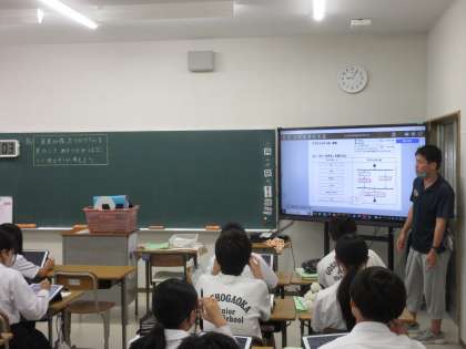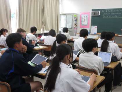 プログラムを見て、どんなことに使えそうか考える学習に取り組んでいました。アクティビティ図を見ながら、プログラムが並列に行えること、双方向性で行えることなど、プログラミングの学習のイメージを広げています。タブレットに示されたプログラムをもとに、熱心に考えを深める生徒たちです。