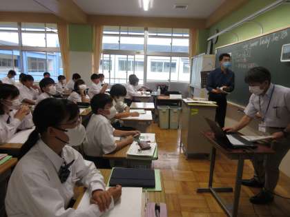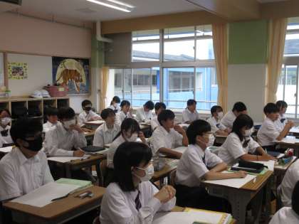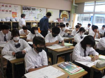 6月18日(火)今日の授業風景 その7 公開日 2024/06/18 更新日 2024/06/18 お知らせ 2年生の英語科の授業です。 ALTと英語の担当の先生の英会話を聞き、ワークシートに本時の学習のポイントとなる言葉を書き込む生徒たち。「could you 〜」を使いながら、英文を完成させていました!英会話を集中して聞く姿が印象的でした。