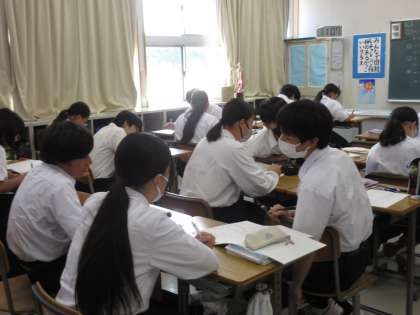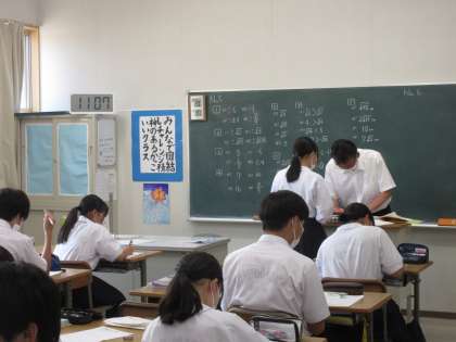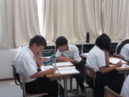 明日のテストに向け、復習プリントに取り組む生徒たち。こちらの教室でも、時には友達からの助言を受けて、根気強く問題を解決する姿が見られました。
