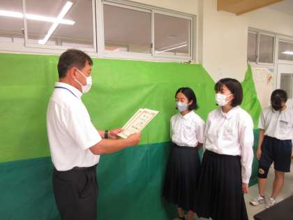 朝の時間を活用し、全学年オンラインでつながり、第2回表彰を実施しました。表彰される生徒は美術室に集合しての実施です!しっかりした返事を聞き、それぞれの場所で大いに力を発揮してきたのだろうと誇りに感じました!