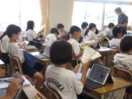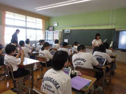 「Reading Masuter」について、担当の先生と生徒たちが共通理解を図っていました。「自分の英文の音読をタブレットに録音し、聞いてみる」という活動にチャレンジします。家庭でも四で録音する取組も行います。タブレットの効果的な活用が進められています!