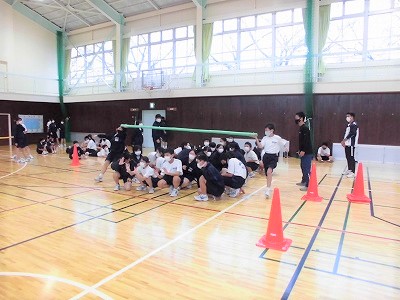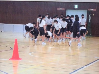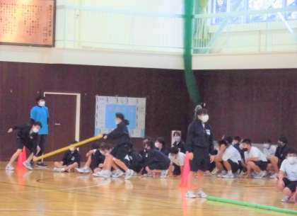 5時間目,1年生が体育館にて学年練習です。分散しての実施です。団体種目「タイフーン」の上手なコツを担任と共に考えながら練習を進めています。頑張ってます!