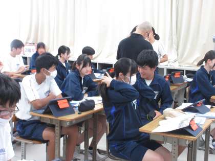 7月8日(月)今日の授業風景 その8 公開日 2024/07/08 更新日 2024/07/08 お知らせ 3年生の英語科の授業の様子です。 「日本のトキについて調べた英文」を読み、電子黒板に映し出された文が本文と合っているかどうかを見極めます。教科書の英文を読み合ったり、電子黒板の英文をALTに合わせて読んだり、進んで学習に取り組む姿が印象的でした!