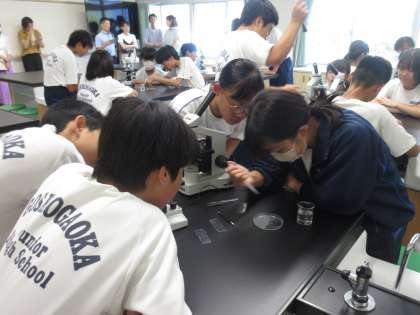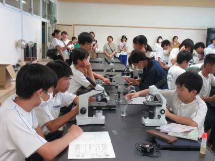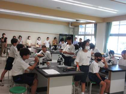 7月8日(月)授業参観・学年懇談会(夏季休業前) その2 公開日 2024/07/08 更新日 2024/07/08 お知らせ 2年生の授業参観(理科)の様子です。 「光合成が行われる場所」について、学習を進めていました。光が当てられたオオカナダモと光が当てられていないオオカナダモ。その葉を顕微鏡で調べていきます。保護者の皆様が参観される中、生徒たちはいつも通り、生き生きと顕微鏡を使った観察に取り組んでいました。