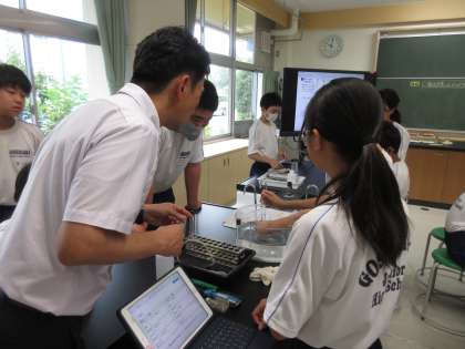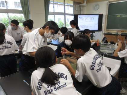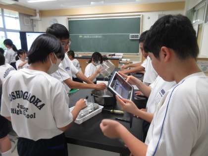 「二酸化炭素にはどのような性質があるか?」をテーマに学習を進めていました。試験管に水と二酸化炭素が入った状態で振ってみたり、二酸化炭素の中に火のついた線香を入れてみたりしながら、実験に取り組んでいました。