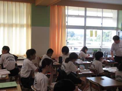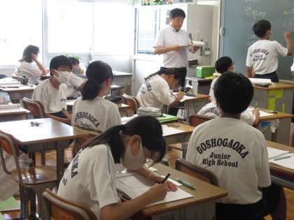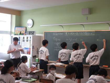 「乗法と除法のまじった式を計算する!」というテーマのもと学習を進めていました。ちょうど、教室を訪問した時は、代表の生徒たちが計算の解き方を黒板に記入しているところでした。根気強く問題を解決しようとする姿、近くの友達と考えを交流する姿・・・など、みなんで今日のテーマに向かって頑張る雰囲気を感じました!
