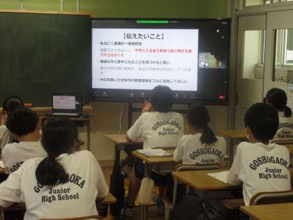 御所ケ丘小学校の6年生、そして、本校1年生は、現在高校3年生の先輩から、「夢や目標の実現するため」というテーマで話を聞くことができました。
