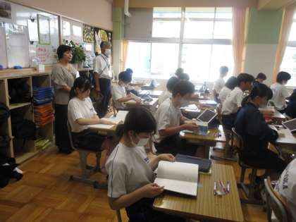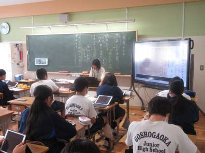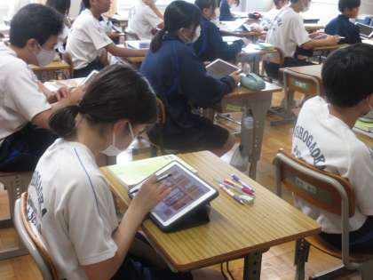 7月17日(水)今日の授業風景 その1 公開日 2024/07/17 更新日 2024/07/17 お知らせ 2年生の国語科の授業です。 「いろいろな動詞の活用になれよう」というテーマのもと、タブレットを活用して学習を進めていました。タブレットに映し出された動詞の活用表をまとめながら、未然形・連用形・・・などのイメージを広げる生徒たちです。積極的にタブレットの活用が進められています。(本授業は、市教育委員会点検評価の訪問をしていただいています。)