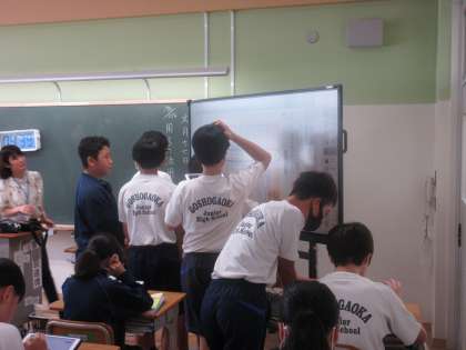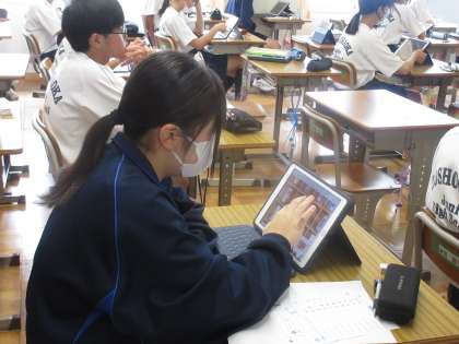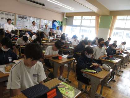 「用言の活用」について学習を進めています。タブレットや電子黒板をフルに活用し、動詞の活用について、生徒たちは考えを広げていました。未然形・連用形・・・など、動詞の活用についてイメージが広がっていました。(学校運営協力員の皆様が授業参観をしてくださっています。)